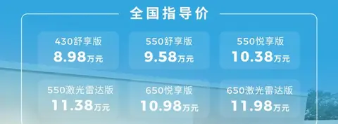 电池分三种规格,续航从430公里到650公里都有。电机功率最低100千瓦,最高160千瓦。四驱版本没给,看来走性价比路线。