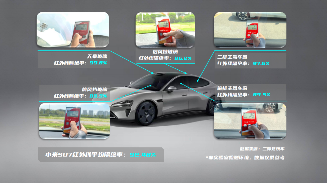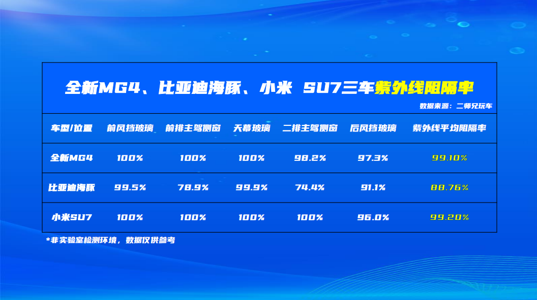 对此,很多车企都在宣传自家的汽车玻璃,具有99%的隔热能力。这是真的吗?今天,我们就用检测来戳破营销滤镜。当全新MG4、小米SU7和比亚迪海豚在烈日下暴晒时,专业汽车自媒体二师兄玩车就用紫外线、红外线检测仪等等设备给我们带来了真实的数据。