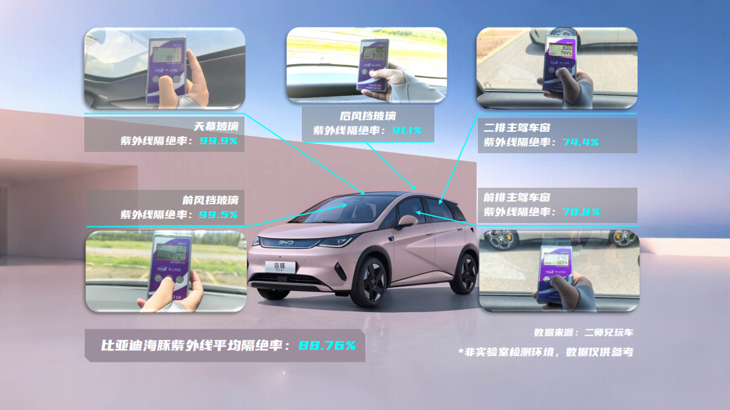 最后的比亚迪海豚,作为一款十万级纯电动车,只能说达成了这一价位的主流水平。常规的双层夹胶前挡玻璃和四门的单层钢化玻璃,能隔绝一定的紫外线,而位于头顶的物理遮阳帘也能起到良好的防晒效果,它的表现可以让人接受。