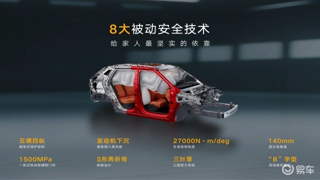 被动安全方面,采用笼式车身结构,其拥有同级最大的27000Nm/°车身扭转刚度,并通过五横四纵高强度框架+S形两折弯纵梁设计+高强度前/后防撞梁+1500MPa一体式热成型硼钢门环等8大被动安全配置,形成“吸能-分散-承载”的立体防护体系,最大限度保障座舱完整,保护乘员安全。