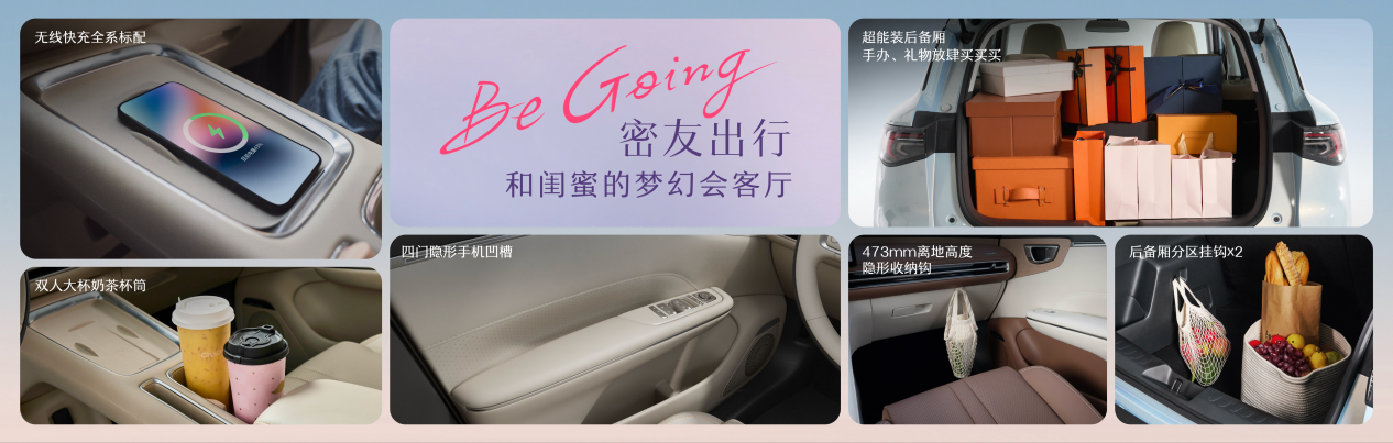 年轻用户出行更关注社交娱乐体验,与闺蜜的欢聚时光因缤果S而更惬意舒心。缤果S前排配备双人奶茶杯筒,深浅搭配奶茶杯“不打架”,人手一杯“快乐水”;前排隐形手机凹槽、多处收纳挂钩等细节配置,手机、外卖袋等小物件都有容身之所;50W无线手机快充,彻底告别手机电量焦虑,美美聚会随心欢乐。
