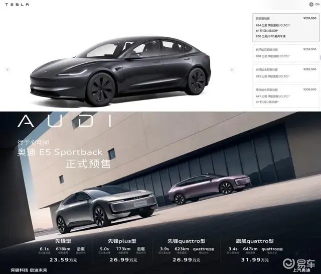 奥迪 E5 Sportback预售车型共四款从23.59-31.99万,与特斯拉Model 3完全重叠,同时两台车都同属于海外知名品牌,恰好主力配置都在30万内,因此它们之间的对决可谓针尖对麦芒,是从品牌力、到产品力再到质价比的全面竞争。