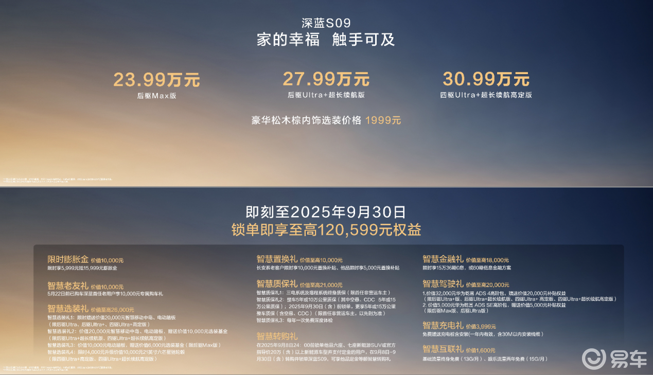 310km纯电续航+5C超充,让续航补能更省心;全系标配华为乾崑ADS 4,解决堵车、停车难题,新手也能轻松开;乘坐体验更是让三排都舒服。三大全维进阶直接把家庭出行的用车“痛点”变成了“亮点”。续航、智能、空间、豪华,深蓝S09超长续航超充版面面俱到,它已不仅是交通工具,更是值得信赖的家庭伙伴。更难得的是,除了起售价23.99万元外,还附多重购车好礼。深蓝S09超长续航超充版的上市,并不是简单的参数升级,而是真正读懂了家庭出行的刚需,以全能的实力巩固其在大六座SUV市场的标杆地位,为市场树立“9系新标杆”。