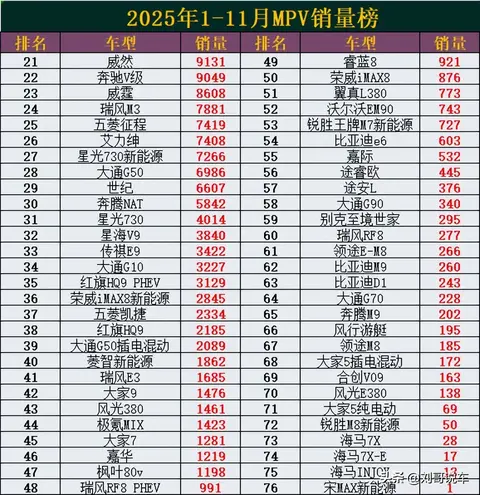 MPV大洗牌!1-11月销量榜,赛那丢冠,魏牌高山第8,理想MEGA第15