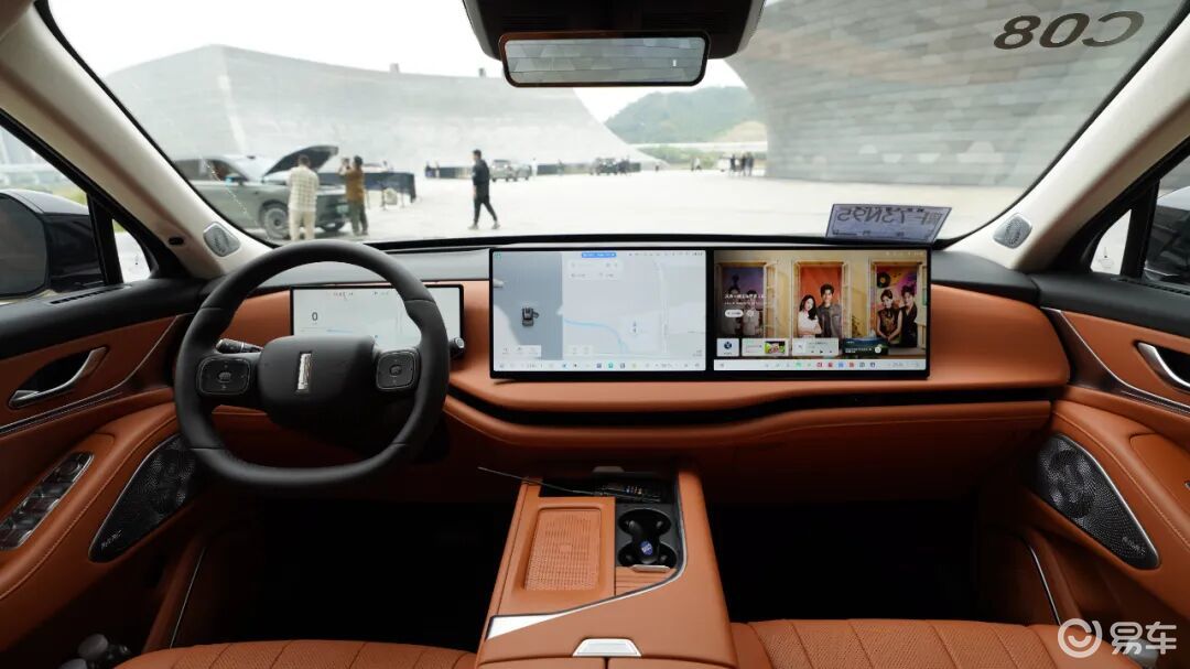 内饰方面,整体布局看上去更为简约,新一代Coffee OS 3.4智慧座舱,双幅式方向盘,配备悬浮式双15.6联屏+17.3寸后排娱乐屏+12.3英寸全液晶仪表盘+29英寸SR-HUD+流媒体后视镜,配备手机无线快充。