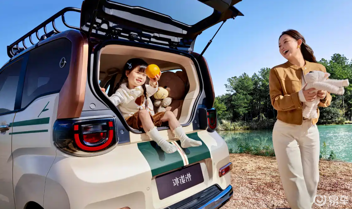 外观方面,2026款QQ冰淇淋女王版的车身以木纹和绿色拉花点缀,格栅的木纹元素与前舱盖的绿色拉花有着不错的辨识度,底部进气口边缘加入了镀铬点缀,新前脸复古中透着精致感。新车侧面以绿色拉花作为腰线,紫铜色轮圈也点题,车顶行李架同样以木纹饰板装饰,尾部的绿色拉花与车头相呼应。