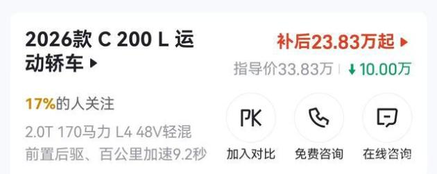 对于预算在25万左右的消费者,可以选择奔驰C级。降价10万后,2026款C200L的售价仅为23.83万。
