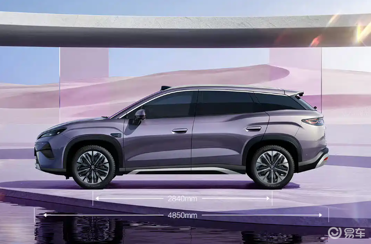 车侧线条流畅,腰线在后排车门处上扬,形成隆起的肩线造型,展现出力量感。作为宋家族中尺寸最大的车型,宋Ultra EV的长宽高分别为4850/1910/1670毫米,轴距达到2840毫米。与宋L DM-i相比,新车轴距增加58毫米,车身长度、宽度和高度均有提升。