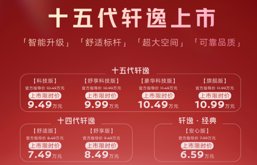 此次上市不仅是十五代轩逸的全新亮相,更标志着轩逸家族的全面升级。东风日产将十五代轩逸与轩逸·经典、十四代轩逸组建全新产品矩阵,形成覆盖6万至11万价格区间的全维度布局:6万级轩逸·经典坚守纯粹品质,是家庭出行的安心之选;8万级十四代轩逸兼顾智能与质感,主打舒适出行体验;9万级十五代轩逸则以双联屏、大沙发双标配,将智能家轿的体验提升至新高度,真正实现“选家轿,必有一款轩逸适合你”。