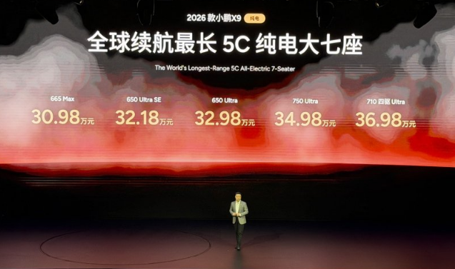 同时,2026款小鹏X9纯电版上市,5款版型售价30.98万元至36.98万元,全系标配800V和5C超充AI电池,充电8分钟可补能400公里续航。