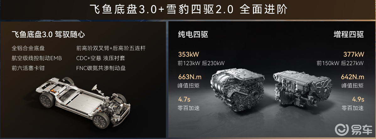 底盘与操控部分,星途EX7同样没有妥协。新车配备飞鱼底盘3.0,采用全铝底盘、CDC电磁减振、可调空气悬架,配合EMB线控制动,系统可以提前预判路面状况,主动调节减振软硬,通过颠簸路面、减速带时舒适性更好。雪豹四驱2.0响应迅速,支持多种驾驶模式,城市、非铺装路面、雨雪天气都有不错的稳定性。