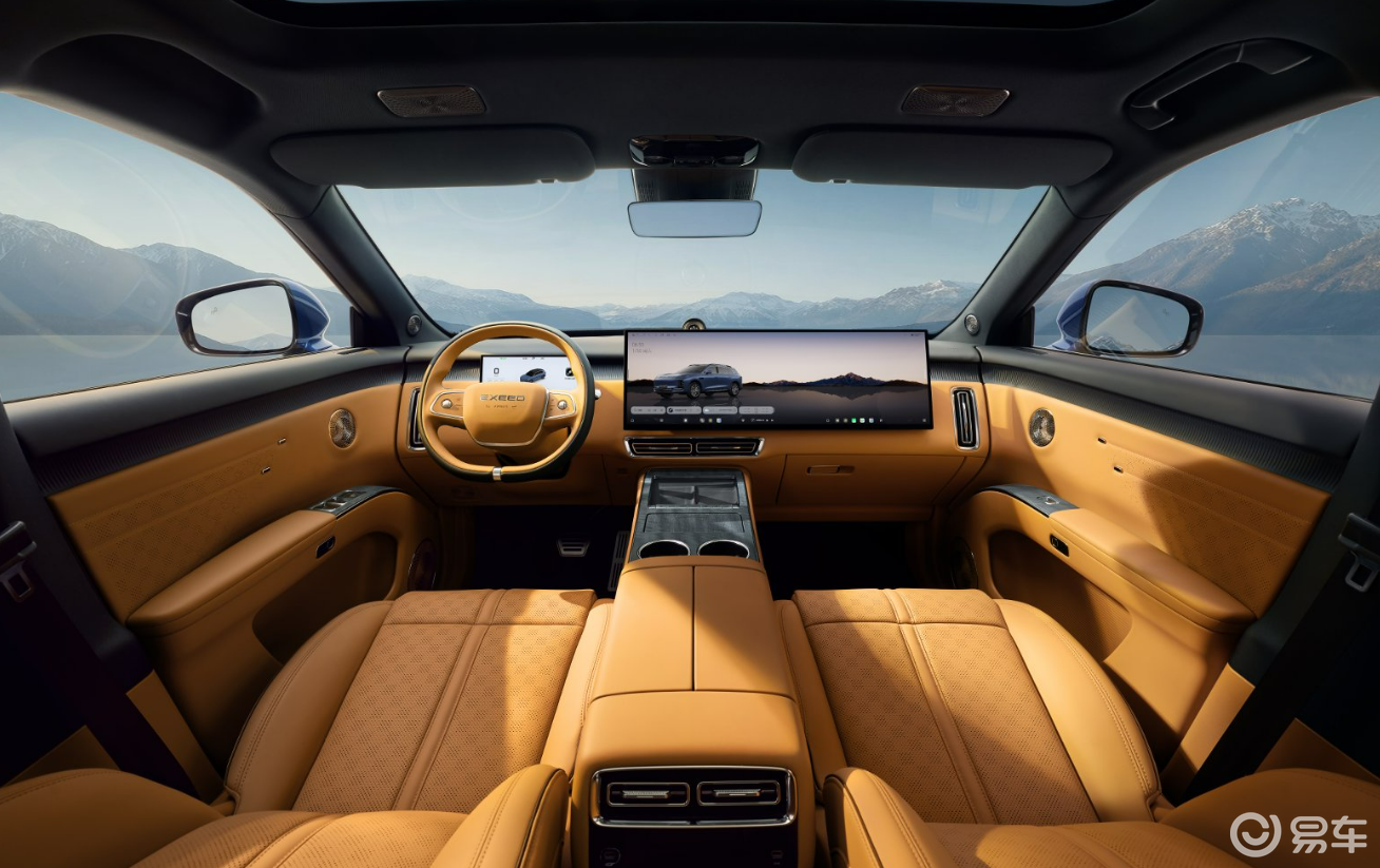 坐进车内,就能感受到星途EX7想要打造的简约科技与中式豪华。车内没有廉价感很强的装饰,设计克制、用料扎实,黑棕内饰配色低调有质感。最显眼的是30英寸6K连体大屏,从主驾延伸到副驾,显示效果和流畅度都达到主流旗舰水平,搭配双辐椭圆形方向盘,手感与科技感兼顾。