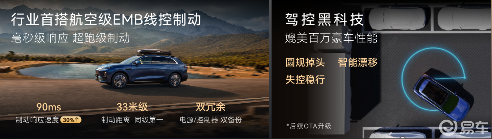 它搭载了全球首发量产的航空级纯机电线控制动系统EMB,舍弃了传统液压刹车结构,改用电信号直接控制,响应速度更快,反应更灵敏。官方100-0km/h制动距离达到33米级,在同级别中表现优秀。同时没有刹车油,后期维护更省心,也避免了漏油、气阻、热衰减等问题,高速、长下坡、冬季用车都更稳定。这套系统还配备双电源、双控制器冗余设计,通过多项严苛测试,是国内首个满足EMB法规的量产车型,安全可靠性经过官方验证。
